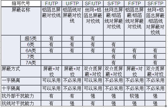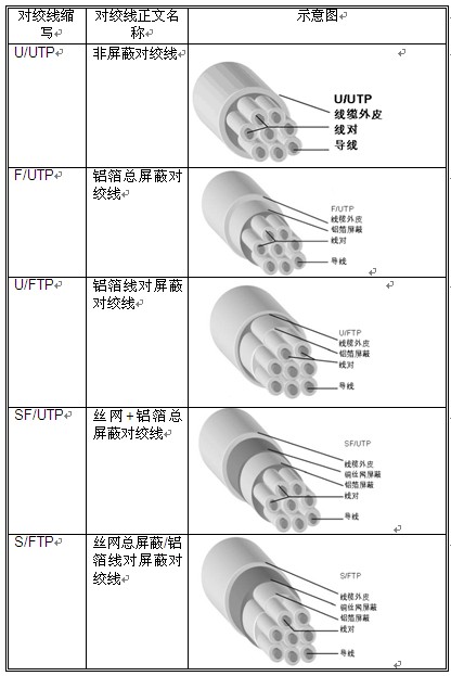 在命名規(guī)則中,非屏蔽對(duì)絞線與屏蔽對(duì)絞線是等同看待的,均使用“平衡線纜”來統(tǒng)稱所有的對(duì)絞線,而用不同的字母(U、F、S)去區(qū)分各種屏蔽類型。例如:U為非屏蔽、F為鋁箔屏蔽、S為絲網(wǎng)屏蔽,并使用“/”區(qū)分是在四對(duì)芯線外進(jìn)行屏蔽,還是在每對(duì)芯線上進(jìn)行屏蔽。