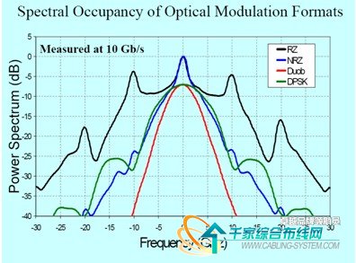 通常存在這樣一個經(jīng)驗關系,信號傳輸?shù)纳⒐钆c其譜寬的平方成正比。圖4比較了幾種常見信號調(diào)制格式的譜寬,可見到紅線所示的光學雙二進制調(diào)制具有最窄的線寬,這說明其天然具有良好的色散抵御力,甚至好于我們常提到的DPSK格式。