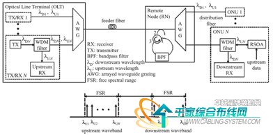 如圖5所示,整個網(wǎng)絡中僅在OLT存在一個寬帶光源,其光譜范圍至少覆蓋使用波分復用器AWG的兩個相鄰自由光譜范圍(FSR)。在發(fā)射端,僅第二個FSR的波長被用來調(diào)制信號,下行傳輸用。由于AWG是典型的線性器件,因此具有環(huán)形光譜響應特性,這樣在RN,使用解復用器后,對特定的ONU,例如ONUn,將有兩個波長輸出,如圖中標識的λUn和λDn。對每個ONU,通過一個WDM濾波器,將λUn和λDn分開,其中λDn信號被探測解調(diào)。而空白波長λUn直接照射在一個反射式的半導體放大器(RSOA)上,用于上行信號調(diào)制。這里的RSOA起到三個作用,其實是可以對信號預放大,其二是相當于一個強度直接調(diào)制器,對上行信號調(diào)制,其三是由于其工作于增益飽和區(qū),因此對噪聲具有較強抑制力。圖5所示的系統(tǒng),通常被稱為使用RSOA的無色WDM-PON。這里以它為例,主要是因為該模式簡單,且原理非常清晰,能夠容易的解釋無色化的含義。但并不是說該方式是最好的,最起碼來說RSOA的調(diào)制速率不高,不可能用于超過2.5Gb/s的調(diào)制。因此,近年來類似的系統(tǒng)時有報道,原理類似,但采用不同的器件,例如RSOA可換成反射式電吸收調(diào)制器等。但這些方法至少從目前來看,都是互有優(yōu)劣,不存在絕對最佳的方案。