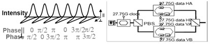 (1) DQPSK+偏振復用,能獲得最大化的頻譜利用率,每字符加載四字節(jié)信號;