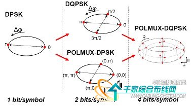 我們知道相位漂移監(jiān)控(DPSK)是非常受關注的調(diào)制格式,因為其是基于相位上的“0”和“π”來表示兩個不同的信號階,因此強度上維持了常數(shù)的包絡。這對高調(diào)制速率信號很有意義,因為常數(shù)強度包絡對非線性具有良好的抵御力。但是從圖中可以看到,DPSK是典型的二進制調(diào)制,頻譜利用率不高。為了進一步提高頻譜利用率,有兩種技術可以被采用。其一是上面提到的偏振復用技術,其二就是DQPSK調(diào)制格式的采用。我們對比圖7和圖3就可以容易的理解,DQPSK本質(zhì)上就是一種光學雙二進制調(diào)制,在“0”和“π”之間引入了“π/2”這個中間參考階,進而將頻譜利用率翻倍。當然,如圖7所示,如果我們同時采用偏振復用和DQPSK調(diào)制,就可以將頻譜利用率提高四倍。和前面提高的光學雙二進制調(diào)制類似,DQPSK格式除了在頻譜利用率上具有優(yōu)勢,同時也能提高對色散、非線性以及PMD的公差。