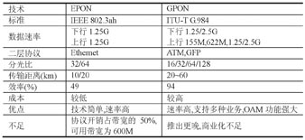 PON技術(shù)的概念是20世紀(jì)90年代初提出的,經(jīng)過10多年的變遷,PON技術(shù)經(jīng)歷了從窄帶PON到APON,再到EPON和GPON的發(fā)展歷程。窄帶PON是基于TDM的,性價比不好已經(jīng)自然消亡。APON是基于ATM的PON技術(shù),雖然標(biāo)準(zhǔn)非常成熟,但由于ATM協(xié)議復(fù)雜且設(shè)備價格較高,提供的接入速率相對較低,現(xiàn)在已不適合采用。目前,業(yè)界最主要的兩個PON標(biāo)準(zhǔn),一個是由IEEE制定的Ethernet PON (EPON)標(biāo)準(zhǔn),另一個是由ITU/FSAN制定的Gigabit PON(GPON)標(biāo)準(zhǔn)。EPON是在以太網(wǎng)基礎(chǔ)上發(fā)展起來的,兼具了無源光網(wǎng)絡(luò)獨特的網(wǎng)絡(luò)結(jié)構(gòu)優(yōu)勢和以太網(wǎng)的低成本優(yōu)勢。GPON是在傳統(tǒng)ATM封裝基礎(chǔ)上進(jìn)一步采用了GFP封裝,以提高效率增加對TDM業(yè)務(wù)的支持。