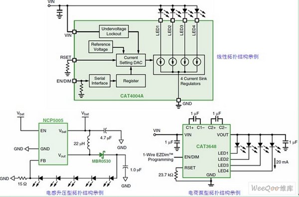 圖1:低壓便攜設(shè)備應(yīng)用的不同LED驅(qū)動(dòng)器拓?fù)浣Y(jié)構(gòu)示例