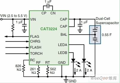 圖3:業(yè)界首款單芯片4 A超級(jí)電容LED驅(qū)動(dòng)器CAT3224應(yīng)用電路圖。