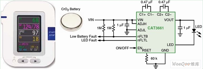 圖4:針對(duì)扣式電池優(yōu)化的CAT3661 LED驅(qū)動(dòng)器應(yīng)用電路圖。